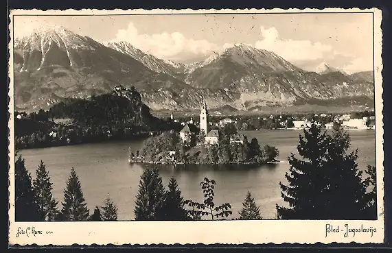 AK Veldes, Panorama mit Bergen und Kirche auf einer Insel