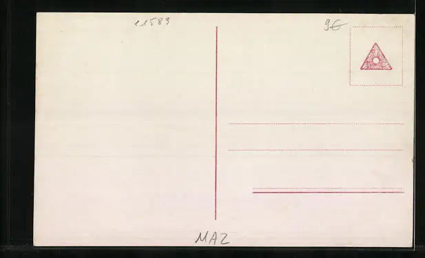 Personenbezogene Daten auf der Rückseite der Karte wurden durch blauen Textmarker unkenntlich gemacht. Die blauen Stellen sind auf die Vorderseite durchgeweicht und wirken sich negativ auf das Postkartenfoto aus