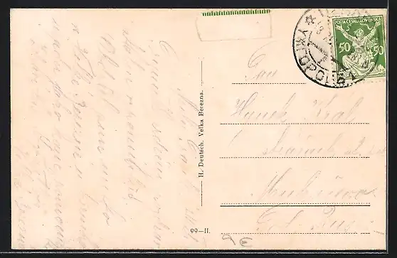 Personenbezogene Daten auf der Rückseite der Karte wurden durch blauen Textmarker unkenntlich gemacht. Die blauen Stellen sind auf die Vorderseite durchgeweicht und wirken sich negativ auf das Postkartenfoto aus