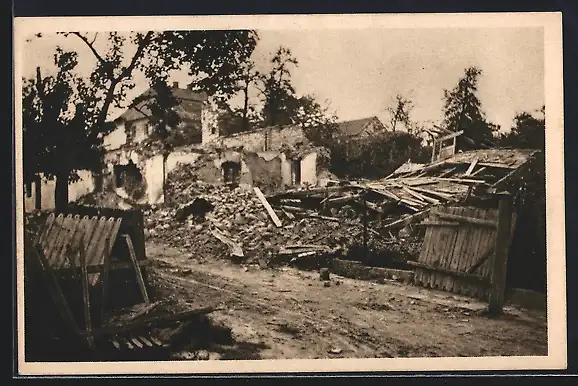 AK Velká Polom, Blick auf ein zerbombtes Haus
