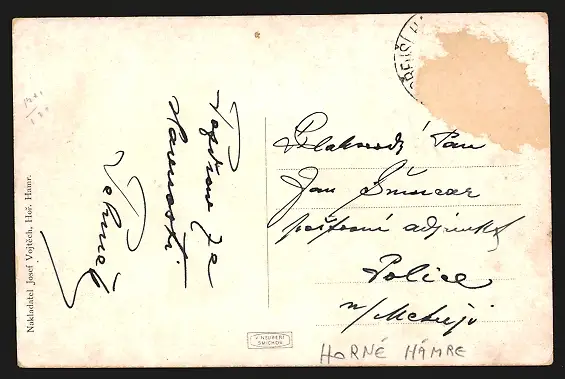 Personenbezogene Daten auf der Rückseite der Karte wurden durch blauen Textmarker unkenntlich gemacht. Die blauen Stellen sind auf die Vorderseite durchgeweicht und wirken sich negativ auf das Postkartenfoto aus
