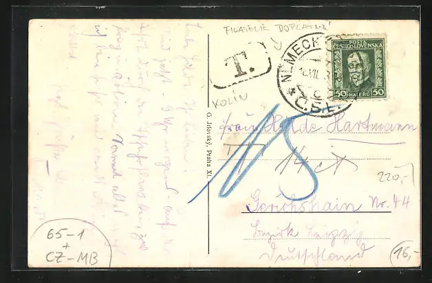 Personenbezogene Daten auf der Rückseite der Karte wurden durch blauen Textmarker unkenntlich gemacht. Die blauen Stellen sind auf die Vorderseite durchgeweicht und wirken sich negativ auf das Postkartenfoto aus