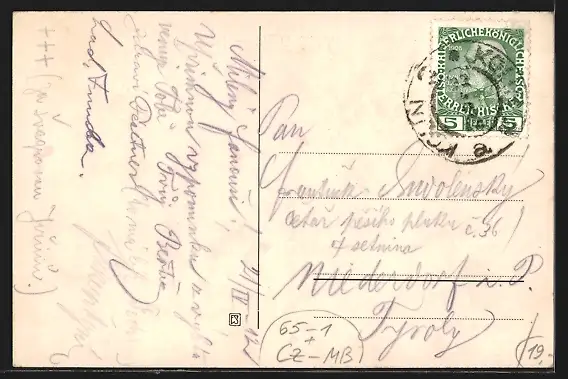 Personenbezogene Daten auf der Rückseite der Karte wurden durch blauen Textmarker unkenntlich gemacht. Die blauen Stellen sind auf die Vorderseite durchgeweicht und wirken sich negativ auf das Postkartenfoto aus
