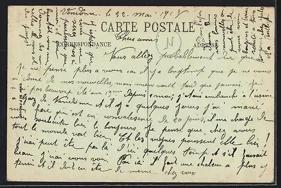 Personenbezogene Daten auf der Rückseite der Karte wurden durch blauen Textmarker unkenntlich gemacht. Die blauen Stellen sind auf die Vorderseite durchgeweicht und wirken sich negativ auf das Postkartenfoto aus