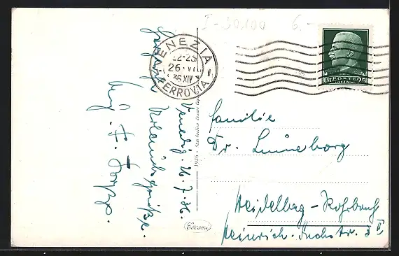 Personenbezogene Daten auf der Rückseite der Karte wurden durch blauen Textmarker unkenntlich gemacht. Die blauen Stellen sind auf die Vorderseite durchgeweicht und wirken sich negativ auf das Postkartenfoto aus