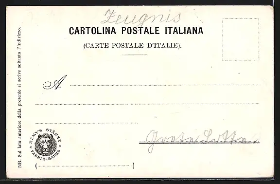Personenbezogene Daten auf der Rückseite der Karte wurden durch blauen Textmarker unkenntlich gemacht. Die blauen Stellen sind auf die Vorderseite durchgeweicht und wirken sich negativ auf das Postkartenfoto aus