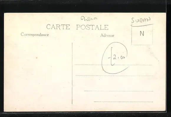 Personenbezogene Daten auf der Rückseite der Karte wurden durch blauen Textmarker unkenntlich gemacht. Die blauen Stellen sind auf die Vorderseite durchgeweicht und wirken sich negativ auf das Postkartenfoto aus