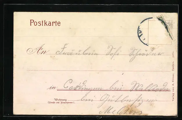 alte Ansichtskarte, gelaufen, Briefmarke entfernt, rückseitig Oberflächenschaden, guter Zustand
