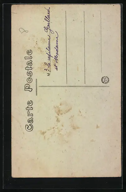 Personenbezogene Daten auf der Rückseite der Karte wurden durch blauen Textmarker unkenntlich gemacht. Die blauen Stellen sind auf die Vorderseite durchgeweicht und wirken sich negativ auf das Postkartenfoto aus