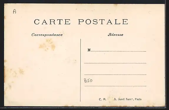 Personenbezogene Daten auf der Rückseite der Karte wurden durch blauen Textmarker unkenntlich gemacht. Die blauen Stellen sind auf die Vorderseite durchgeweicht und wirken sich negativ auf das Postkartenfoto aus