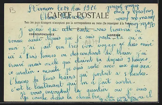 Personenbezogene Daten auf der Rückseite der Karte wurden durch blauen Textmarker unkenntlich gemacht. Die blauen Stellen sind auf die Vorderseite durchgeweicht und wirken sich negativ auf das Postkartenfoto aus