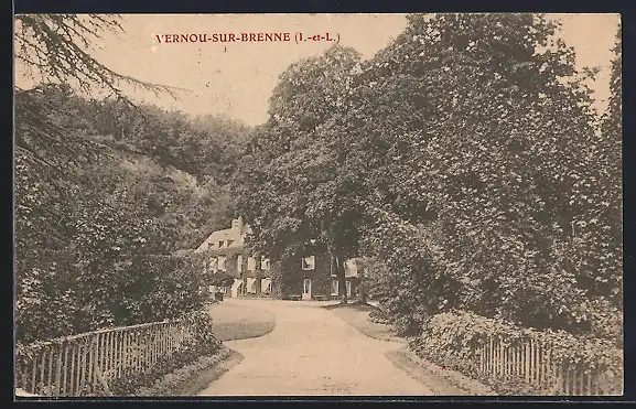 AK Vernou-sur-Brenne, Route bordée d`arbres menant à une maison ancienne