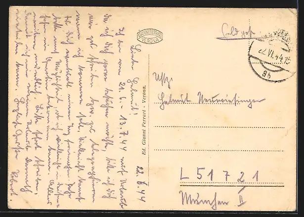 gelaufen 1944, Eckknicke links u. rechts oben und links unten, guter Zustand