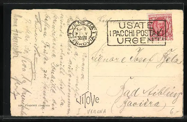 Personenbezogene Daten auf der Rückseite der Karte wurden durch blauen Textmarker unkenntlich gemacht. Die blauen Stellen sind auf die Vorderseite durchgeweicht und wirken sich negativ auf das Postkartenfoto aus