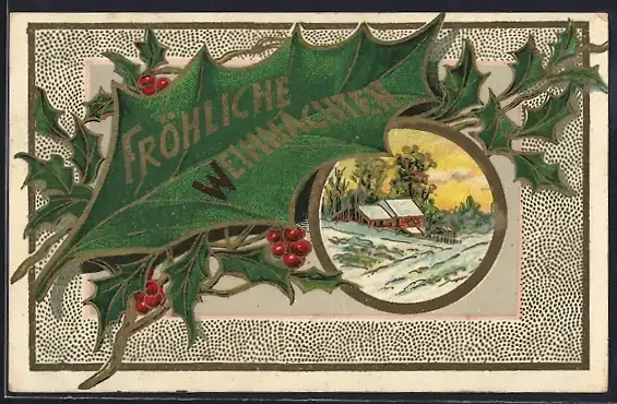 AK Verschneiter Hof im Stechpalmen-Passepartout