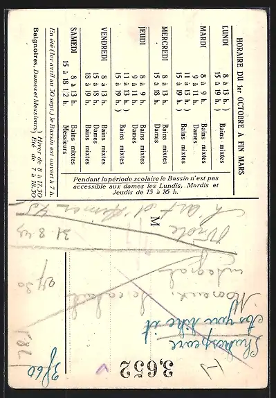 Personenbezogene Daten auf der Rückseite der Karte wurden durch blauen Textmarker unkenntlich gemacht. Die blauen Stellen sind auf die Vorderseite durchgeweicht und wirken sich negativ auf das Postkartenfoto aus