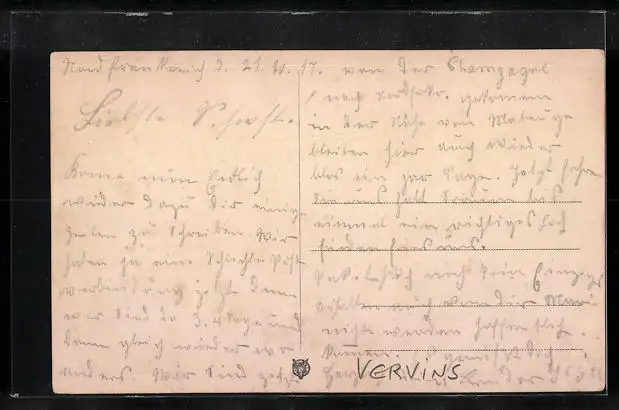 Personenbezogene Daten auf der Rückseite der Karte wurden durch blauen Textmarker unkenntlich gemacht. Die blauen Stellen sind auf die Vorderseite durchgeweicht und wirken sich negativ auf das Postkartenfoto aus
