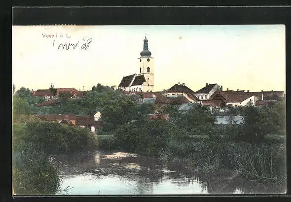AK Veseli, Teilansicht mit Teich und Kirche