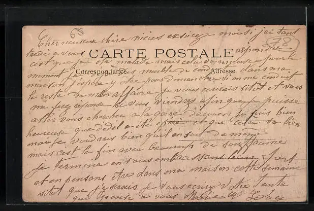 Personenbezogene Daten auf der Rückseite der Karte wurden durch blauen Textmarker unkenntlich gemacht. Die blauen Stellen sind auf die Vorderseite durchgeweicht und wirken sich negativ auf das Postkartenfoto aus
