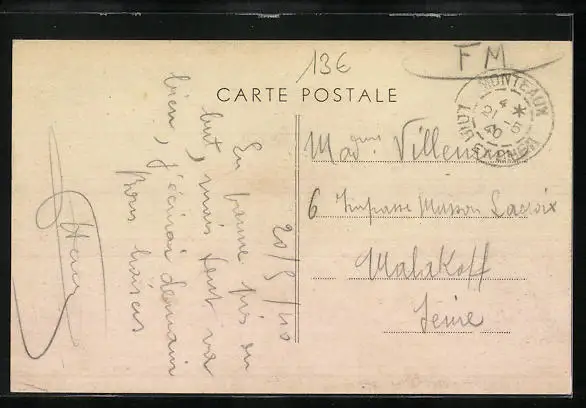 Personenbezogene Daten auf der Rückseite der Karte wurden durch blauen Textmarker unkenntlich gemacht. Die blauen Stellen sind auf die Vorderseite durchgeweicht und wirken sich negativ auf das Postkartenfoto aus