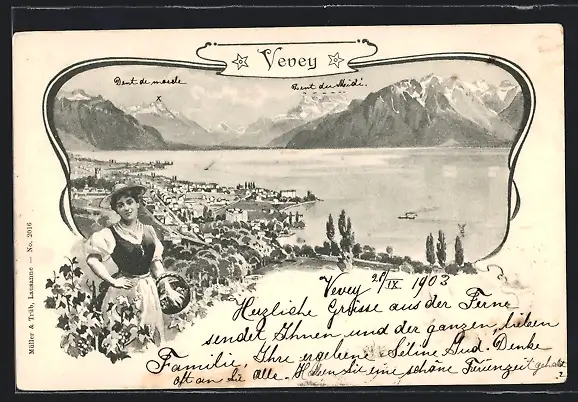 AK Vevey, Ortsansicht mit Dame in Tracht im Vordergrund