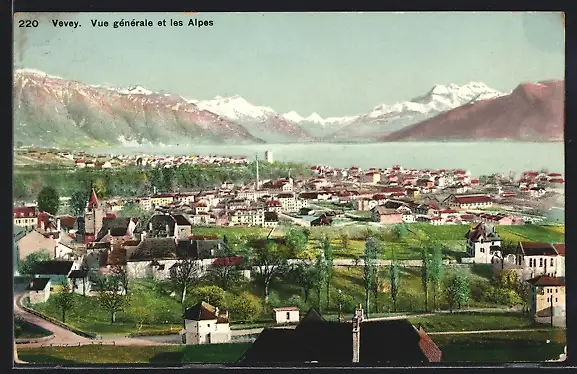AK Vevey, Vue generale et les Alpes