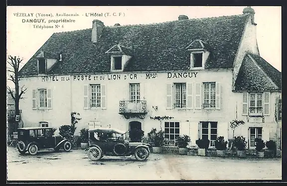 AK Vézelay, L`Hôtel de la Poste et du Lion d`Or avec voitures anciennes