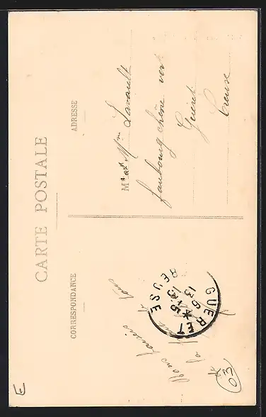 Personenbezogene Daten auf der Rückseite der Karte wurden durch blauen Textmarker unkenntlich gemacht. Die blauen Stellen sind auf die Vorderseite durchgeweicht und wirken sich negativ auf das Postkartenfoto aus