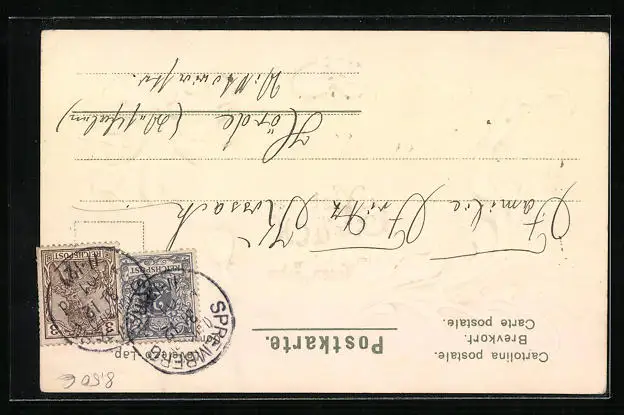 Personenbezogene Daten auf der Rückseite der Karte wurden durch blauen Textmarker unkenntlich gemacht. Die blauen Stellen sind auf die Vorderseite durchgeweicht und wirken sich negativ auf das Postkartenfoto aus
