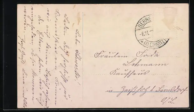 Personenbezogene Daten auf der Rückseite der Karte wurden durch blauen Textmarker unkenntlich gemacht. Die blauen Stellen sind auf die Vorderseite durchgeweicht und wirken sich negativ auf das Postkartenfoto aus