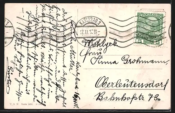Personenbezogene Daten auf der Rückseite der Karte wurden durch blauen Textmarker unkenntlich gemacht. Die blauen Stellen sind auf die Vorderseite durchgeweicht und wirken sich negativ auf das Postkartenfoto aus