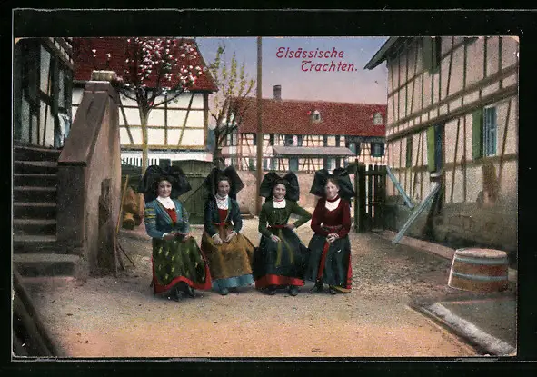 AK Vier hübsche junge Damen in Elsässer Trachten in trauter Runde