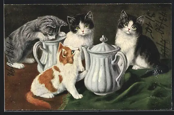 AK Vier kleine Katzen mit Milch- und Kaffeekanne