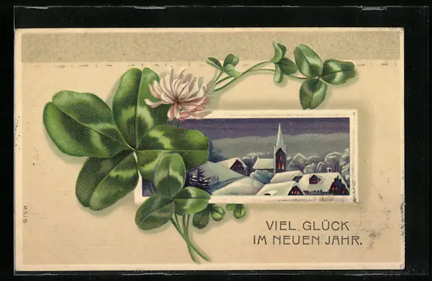 AK Vierblättriges Kleeblatt vor verschneiter Ortschaft, Neujahrsgruss