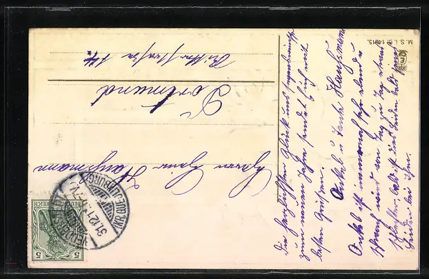 Personenbezogene Daten auf der Rückseite der Karte wurden durch blauen Textmarker unkenntlich gemacht. Die blauen Stellen sind auf die Vorderseite durchgeweicht und wirken sich negativ auf das Postkartenfoto aus