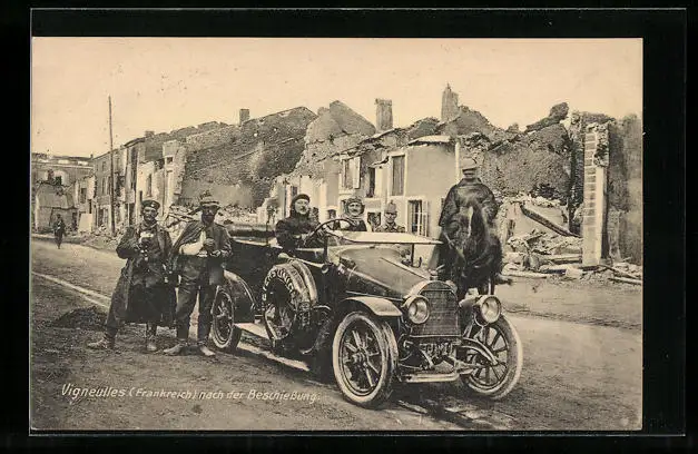 AK Vigneulles, Strassenpartie mit Ruinen, Automobil