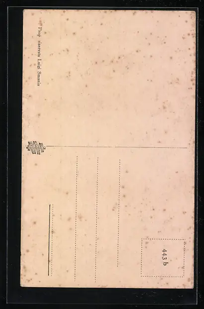Personenbezogene Daten auf der Rückseite der Karte wurden durch blauen Textmarker unkenntlich gemacht. Die blauen Stellen sind auf die Vorderseite durchgeweicht und wirken sich negativ auf das Postkartenfoto aus