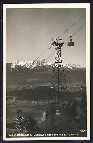 AK Villach-Kanzelbahn, Blick auf die Stadt und Mangart, Gondel