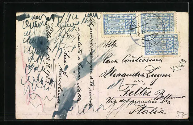 Personenbezogene Daten auf der Rückseite der Karte wurden durch blauen Textmarker unkenntlich gemacht. Die blauen Stellen sind auf die Vorderseite durchgeweicht und wirken sich negativ auf das Postkartenfoto aus