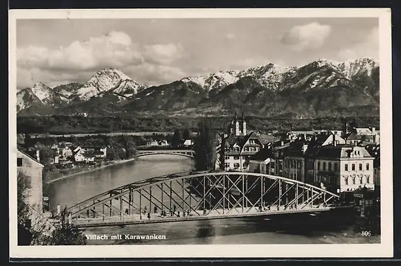 AK Villach, Uferpartie mit Brücke und Karawanken