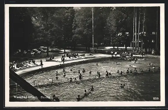 AK Villach, Warmbad Aussenansicht mit Schwimmern
