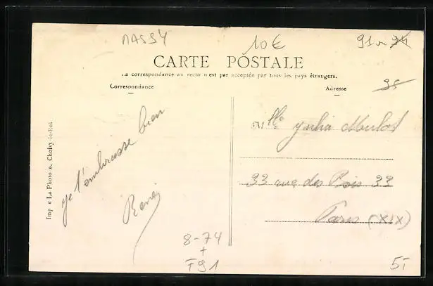 Personenbezogene Daten auf der Rückseite der Karte wurden durch blauen Textmarker unkenntlich gemacht. Die blauen Stellen sind auf die Vorderseite durchgeweicht und wirken sich negativ auf das Postkartenfoto aus
