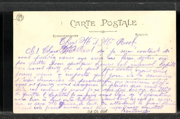 Personenbezogene Daten auf der Rückseite der Karte wurden durch blauen Textmarker unkenntlich gemacht. Die blauen Stellen sind auf die Vorderseite durchgeweicht und wirken sich negativ auf das Postkartenfoto aus