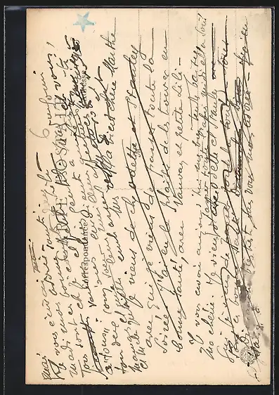 Personenbezogene Daten auf der Rückseite der Karte wurden durch blauen Textmarker unkenntlich gemacht. Die blauen Stellen sind auf die Vorderseite durchgeweicht und wirken sich negativ auf das Postkartenfoto aus