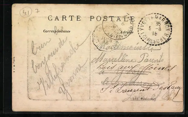 Personenbezogene Daten auf der Rückseite der Karte wurden durch blauen Textmarker unkenntlich gemacht. Die blauen Stellen sind auf die Vorderseite durchgeweicht und wirken sich negativ auf das Postkartenfoto aus