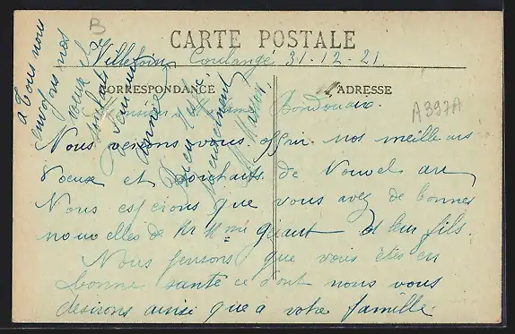 Personenbezogene Daten auf der Rückseite der Karte wurden durch blauen Textmarker unkenntlich gemacht. Die blauen Stellen sind auf die Vorderseite durchgeweicht und wirken sich negativ auf das Postkartenfoto aus