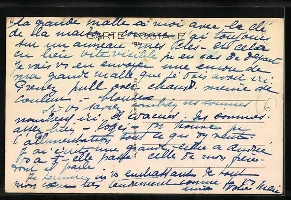 Personenbezogene Daten auf der Rückseite der Karte wurden durch blauen Textmarker unkenntlich gemacht. Die blauen Stellen sind auf die Vorderseite durchgeweicht und wirken sich negativ auf das Postkartenfoto aus