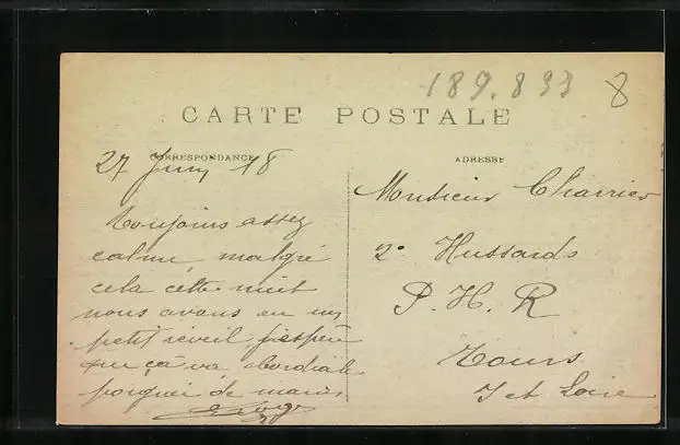 Personenbezogene Daten auf der Rückseite der Karte wurden durch blauen Textmarker unkenntlich gemacht. Die blauen Stellen sind auf die Vorderseite durchgeweicht und wirken sich negativ auf das Postkartenfoto aus