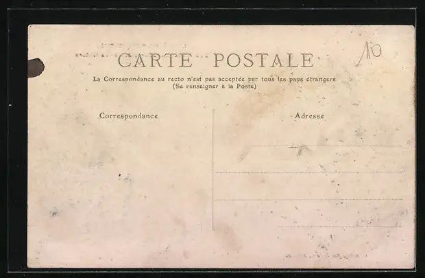 Personenbezogene Daten auf der Rückseite der Karte wurden durch blauen Textmarker unkenntlich gemacht. Die blauen Stellen sind auf die Vorderseite durchgeweicht und wirken sich negativ auf das Postkartenfoto aus