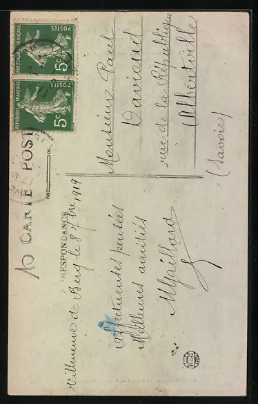 Personenbezogene Daten auf der Rückseite der Karte wurden durch blauen Textmarker unkenntlich gemacht. Die blauen Stellen sind auf die Vorderseite durchgeweicht und wirken sich negativ auf das Postkartenfoto aus